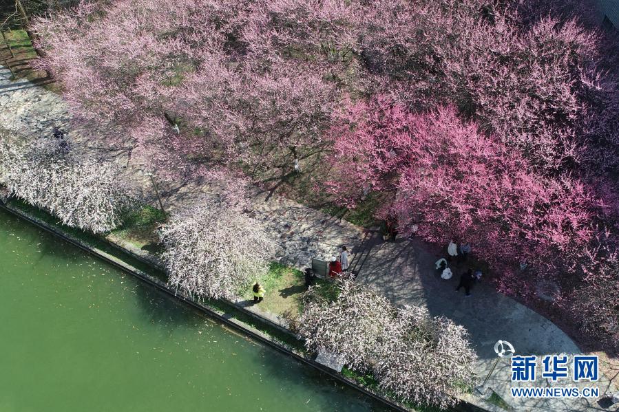 2月14日,在湖南省湘西土家族苗族自治州吉首大學(xué),市民在梅園里賞花(無人機(jī)照片)。新華社發(fā)(彭彪 攝)