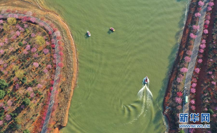 2月14日,游客在湖南省常寧市羅橋鎮(zhèn)櫻花園游玩 (無人機(jī)照片) 。新華社發(fā)(曹正平 攝)