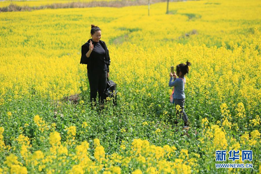 2月14日,在貴州省黔東南苗族侗族自治州黎平縣,游人在油菜花田賞花游玩。新華社發(徐基茂 攝)