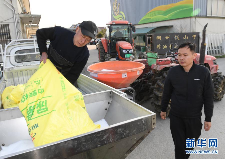 2月23日,湖州錢山下糧油專業合作社工作人員在農機內裝載化肥準備施肥。立春過后氣溫回升,浙江省湖州市吳興區道場鄉全力開展春耕工作。今年該鄉計劃播種農作物總面積1.2萬畝,其中水稻5000畝、小麥2000畝。新華社記者 翁忻旸 攝