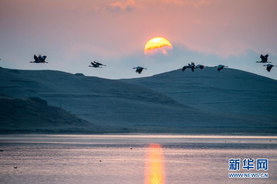 日出時分,黑頸鶴在大山包黑頸鶴國家級自然保護區飛翔(2月25日攝)。新華社記者 胡超 攝