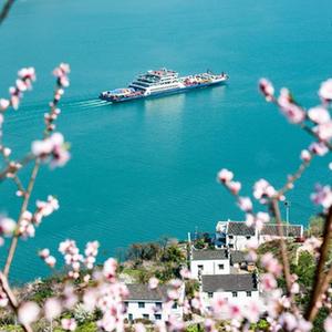 春到三峽,桃花盛開,江水碧綠,船舶往來如梭,構成一幅幅美麗的圖畫。