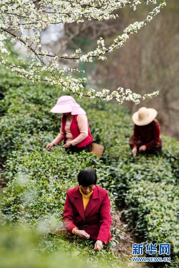 3月4日,安康市漢濱區流水鎮群眾在采摘新茶。新華社記者 陶明 攝