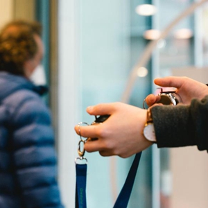 3月8日,德國科隆一家書店的工作人員在入口處手拿計數器限制客流。