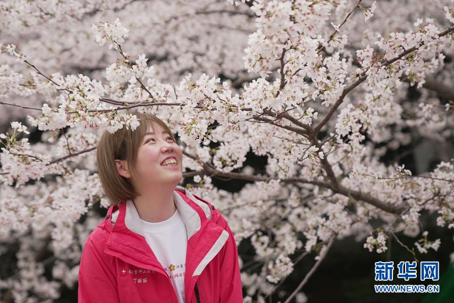 3月13日,武漢雷神山醫院醫護人員在櫻花樹下賞花。新華社記者 熊琦 攝