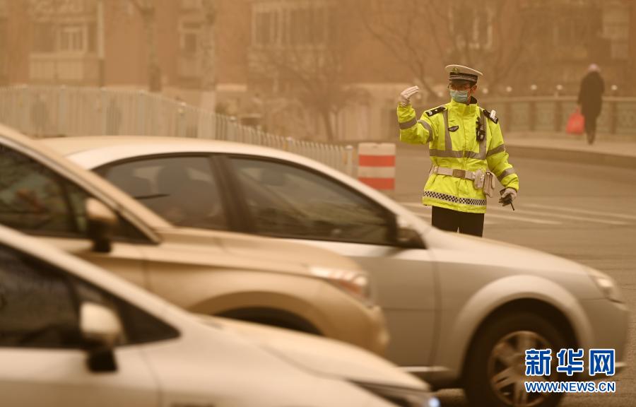 3月15日,交警在天津市南開區道路上執勤。當日,我國北方多地出現沙塵天氣。新華社記者 李然 攝