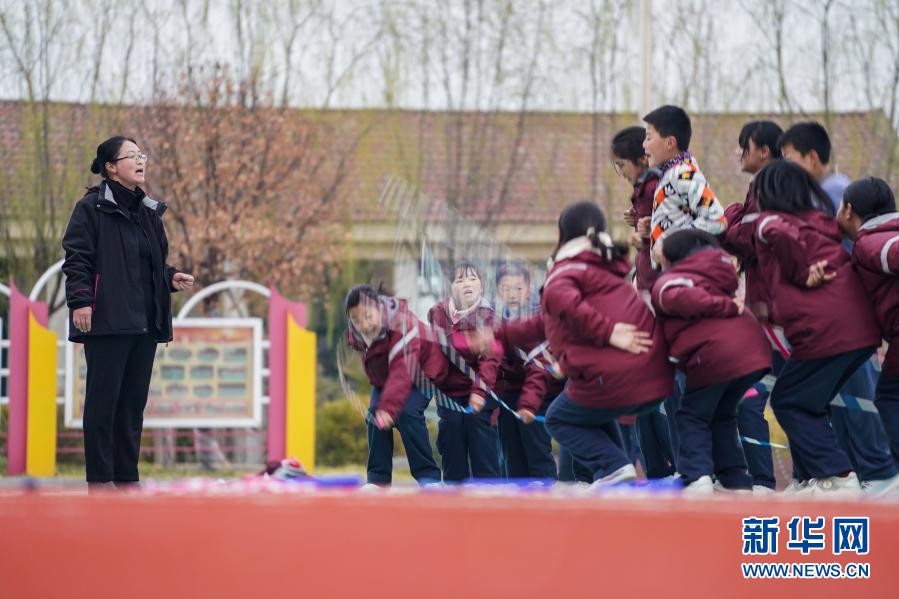 騎路小學劉彥老師(左一)指導同學們練習"大網(wǎng)繩跳"(3月9日攝)。新華社記者 李博 攝