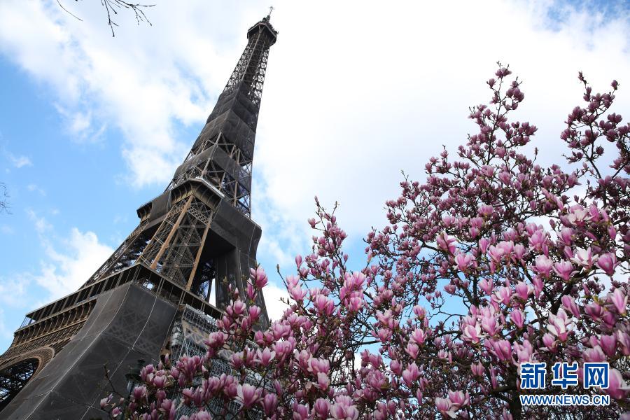 這是3月19日在法國巴黎埃菲爾鐵塔腳下的戰神廣場拍攝的盛放的玉蘭花。新華社記者高靜攝