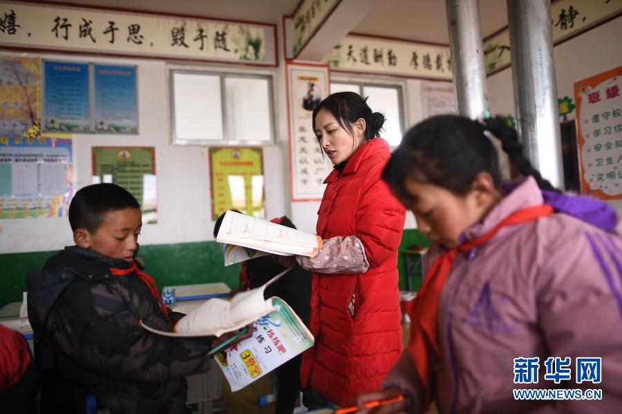3月16日,索加鄉寄宿小學數學老師卓瑪才吉(左二)在課后輔導學生功課。新華社記者 駱曉飛 攝