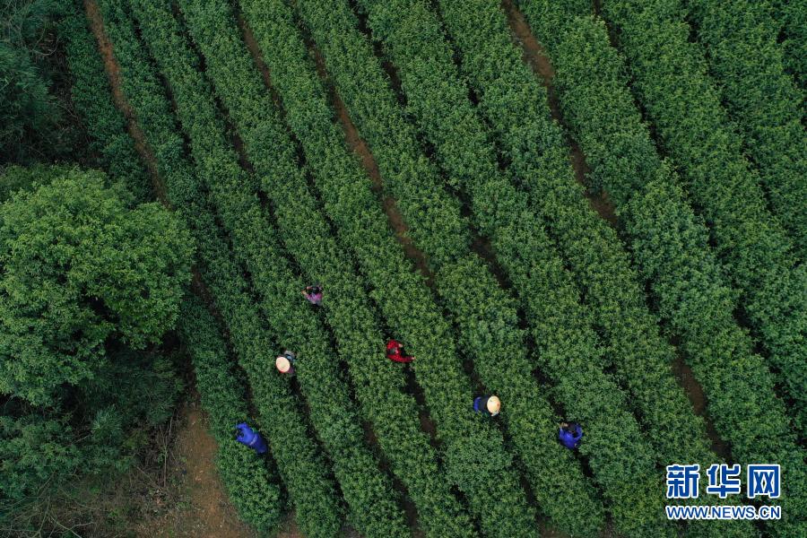 3月20日,采茶工在余杭區余杭街道竹園村的茶園采摘茶葉(無人機照片)。