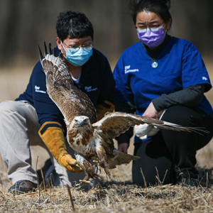 當(dāng)日,北京猛禽救助中心在北京市延慶區(qū)野鴨湖濕地公園附近空地放飛了兩只康復(fù)治療后的大鵟。此次放飛的兩只大鵟在去年12月分別被市民發(fā)現(xiàn),其中一只因饑餓、虛弱原因被救治,另一只因闖入市民鴿舍覓食被發(fā)現(xiàn)且身體有創(chuàng)傷被救治。經(jīng)過三個月的治療,兩只大鵟均已康復(fù)并達(dá)到了放歸野外標(biāo)準(zhǔn)。北京猛禽救助中心的猛禽康復(fù)師為兩只大鵟佩戴了GPS追蹤器,以監(jiān)測它們被放歸大自然后的情況。