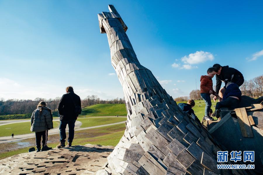 3月20日,人們在比利時博姆市的德舒爾森林公園和一座“巨人”雕塑“玩耍”。新華社記者 張鋮 攝