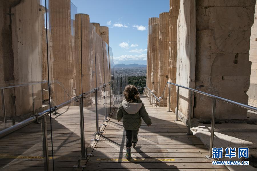 3月22日,一名游客游覽希臘雅典衛(wèi)城。希臘露天考古遺跡22日起恢復(fù)開放。游客需遵守保持社交距離和佩戴口罩等防疫規(guī)定。新華社發(fā)(萊夫特里斯·帕察里斯攝)