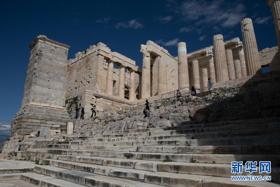 3月22日,游客游覽希臘雅典衛城。希臘露天考古遺跡22日起恢復開放。游客需遵守保持社交距離和佩戴口罩等防疫規定。新華社發(萊夫特里斯·帕察里斯攝)