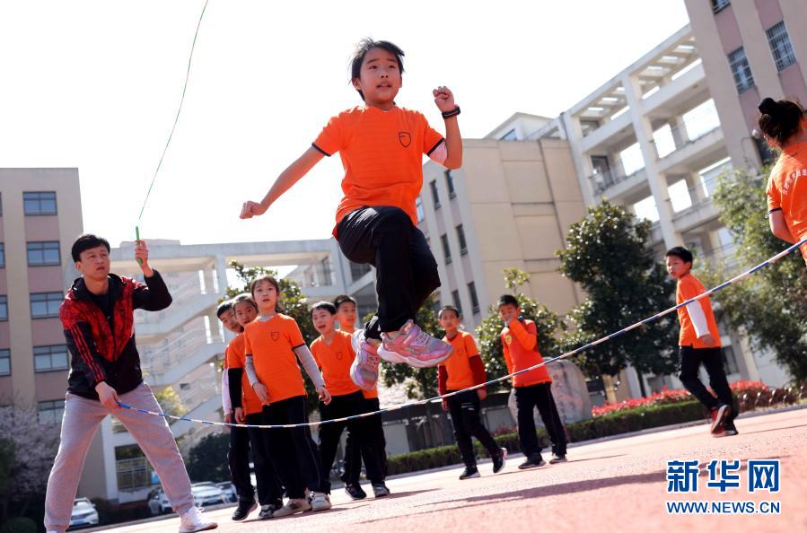 3月23日,在合肥市大通路小學新海校區,學生在大課間練習花樣跳繩。