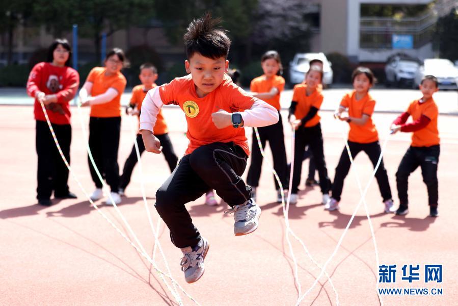 3月23日,在合肥市大通路小學(xué)新海校區(qū),學(xué)生在大課間練習(xí)花樣跳繩。