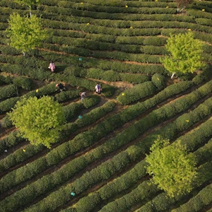 3月24日,茶農在黃山毛峰唐模標準化生態(tài)茶園里采茶(無人機照片)。