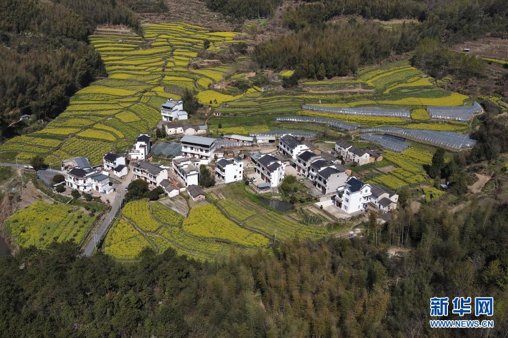 這是3月26日拍攝的花海中的黃山市徽州區(qū)靈山村(無人機(jī)照片)。