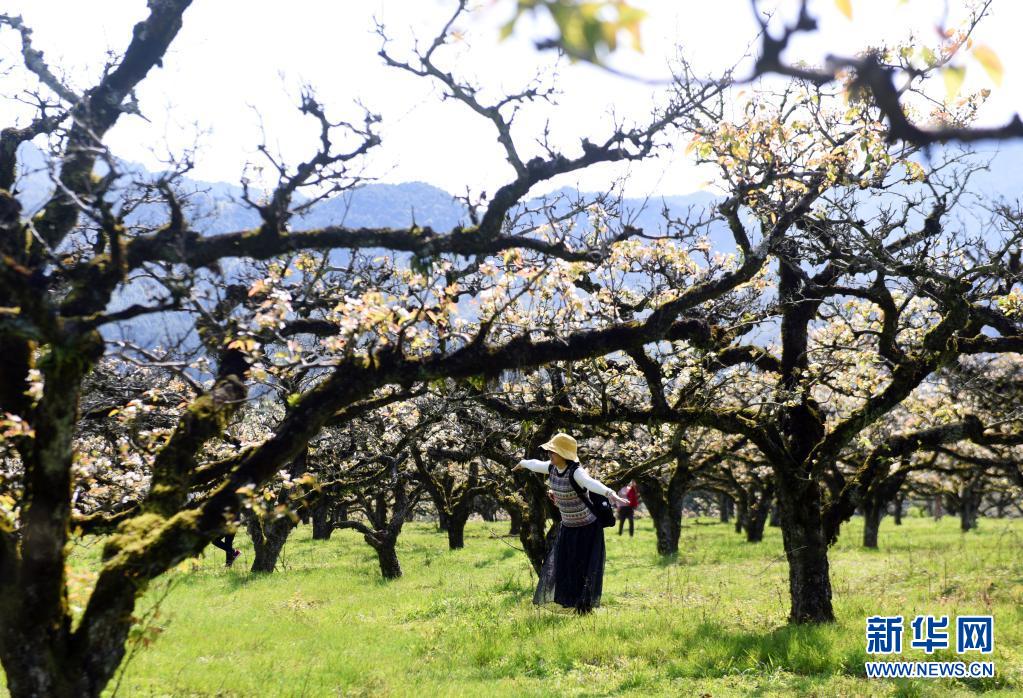 3月26日,游客在福建省南平市光澤縣李坊鄉管密村的梨花園里踏青賞花。