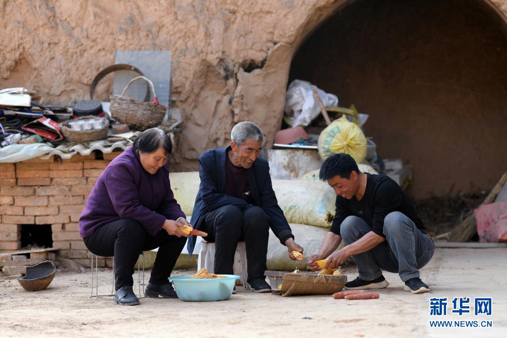 在山西省石樓縣鐵頭村,張尚保(中)和家人在院子里干農(nóng)活(3月24日攝)。新華社發(fā)(劉亮亮 攝)