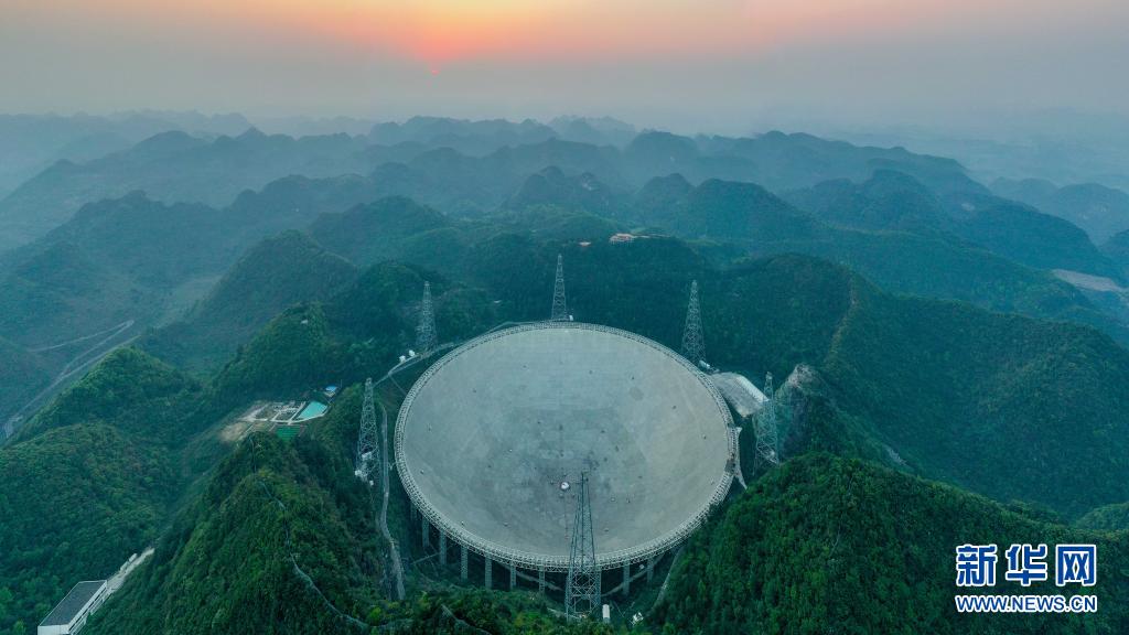 在貴州省平塘縣,被譽為“中國天眼”的500米口徑球面射電望遠鏡(FAST)在群山中仰望星空,探求著宇宙奧秘。