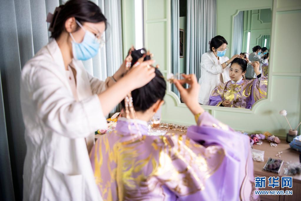 5月4日,在太原古縣城的一家店鋪內,游客化妝準備體驗古風拍攝。