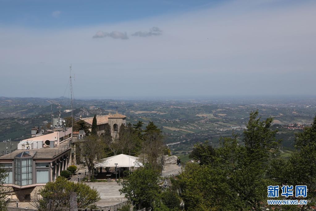 5月6日,人們在圣馬力諾城中的一處平臺上欣賞風景。