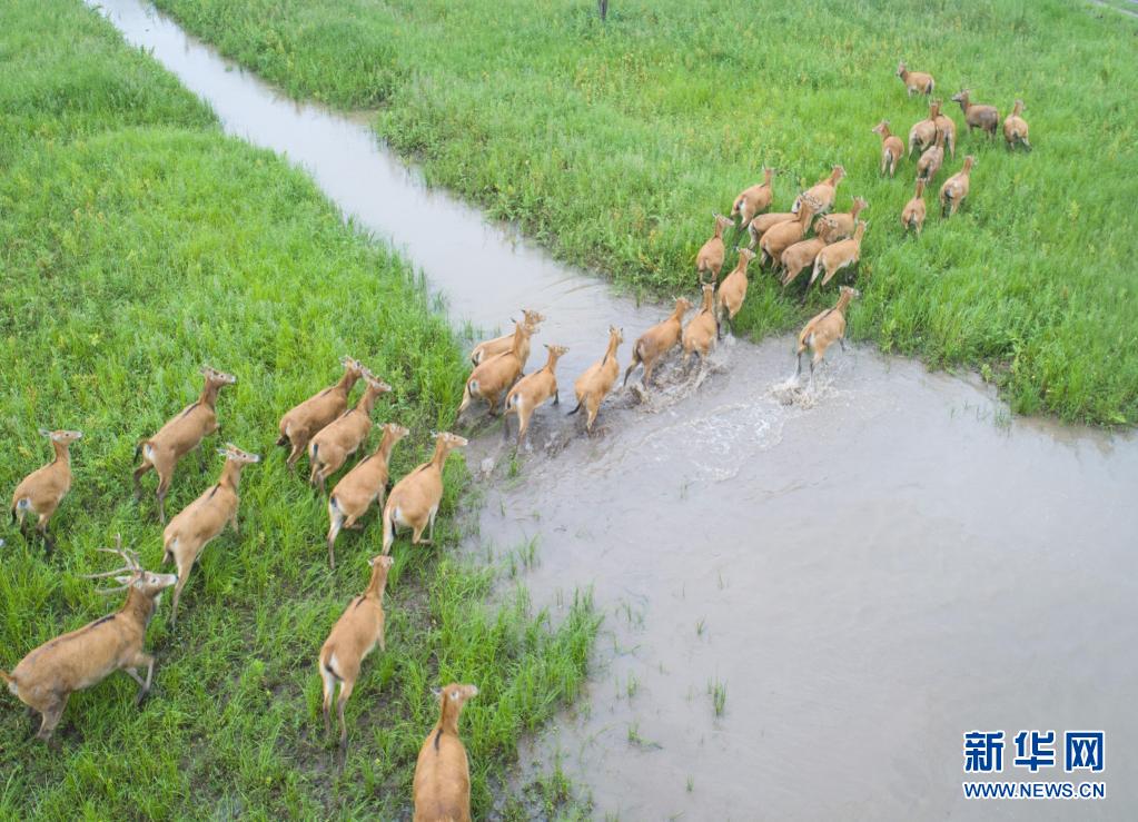 5月17日,一群麋鹿在石首麋鹿國家級自然保護區內活動(無人機照片)。新華社記者 肖藝九 攝