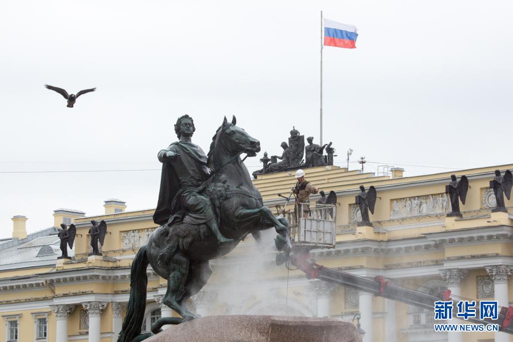 當日,圣彼得堡市政府的工作人員把彼得大帝“青銅騎士”的雕像清潔一新。圣彼得堡于1703年由彼得大帝奠基,今年的5月27日是圣彼得堡建城318周年紀念日。
