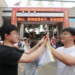 6月9日,在湖南省婁底市第二中學(xué)考點(diǎn),老大李慶國(guó)(左)和老三李慶民考完最后一科生物后,在校門口相遇。