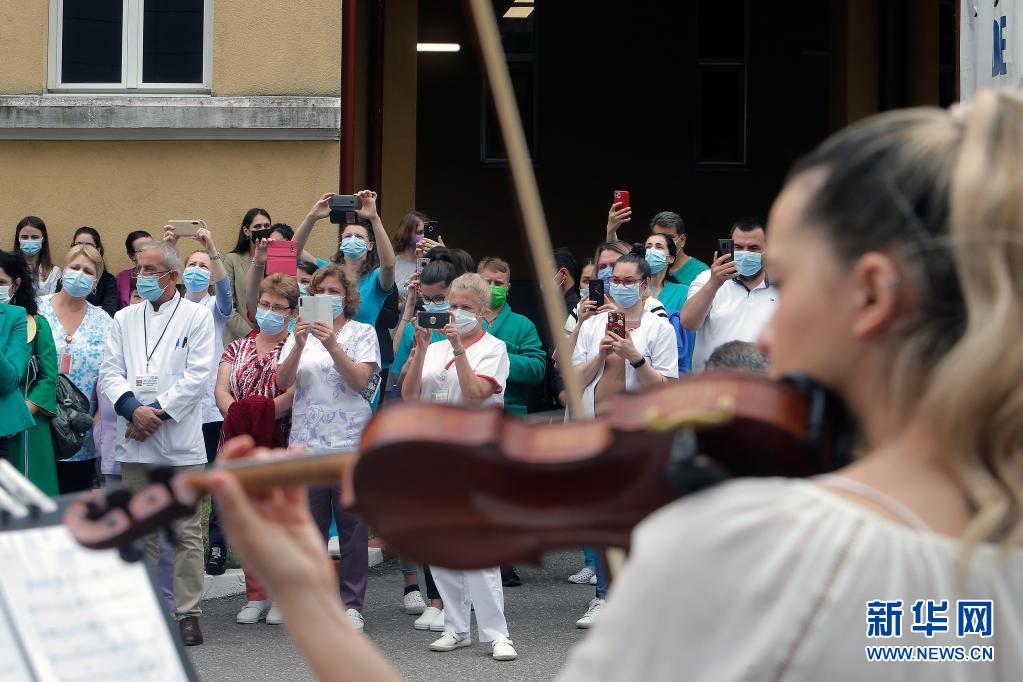當(dāng)日,羅馬尼亞首都布加勒斯特一個(gè)樂(lè)隊(duì)在該國(guó)一家傳染病醫(yī)院——馬太·巴爾什醫(yī)院演出,向抗擊新冠疫情的醫(yī)務(wù)工作者致謝。