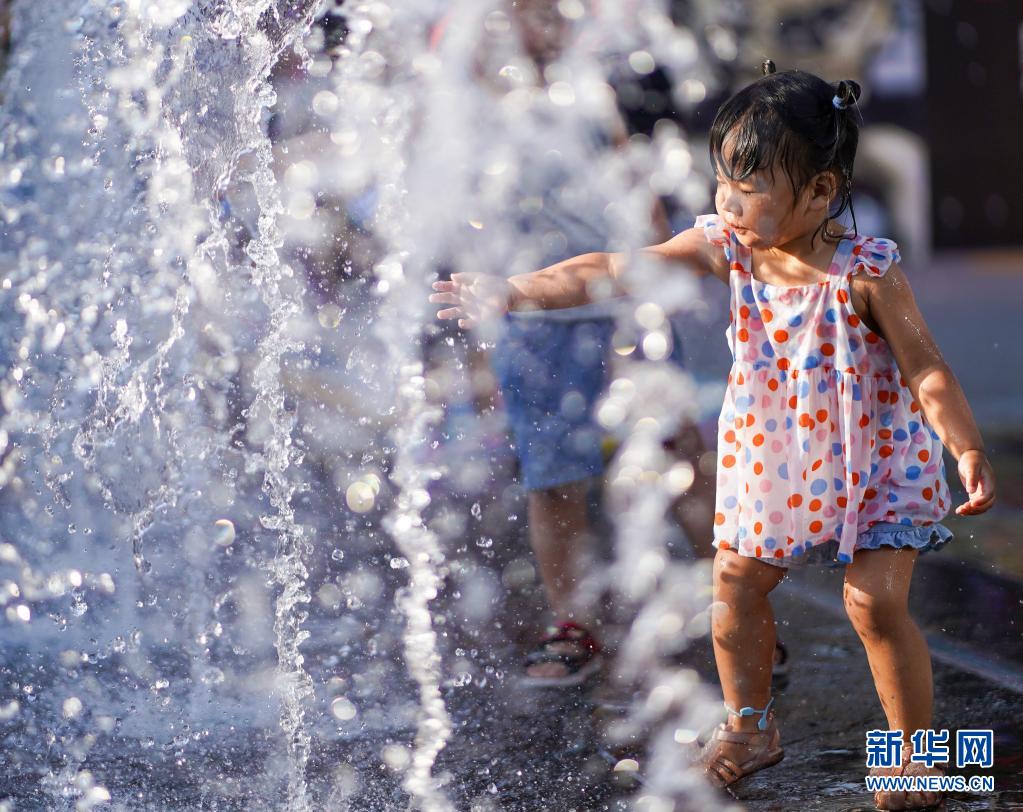 6月20日,小女孩在北京華熙LIVE·五棵松商業街區一處噴泉戲水。