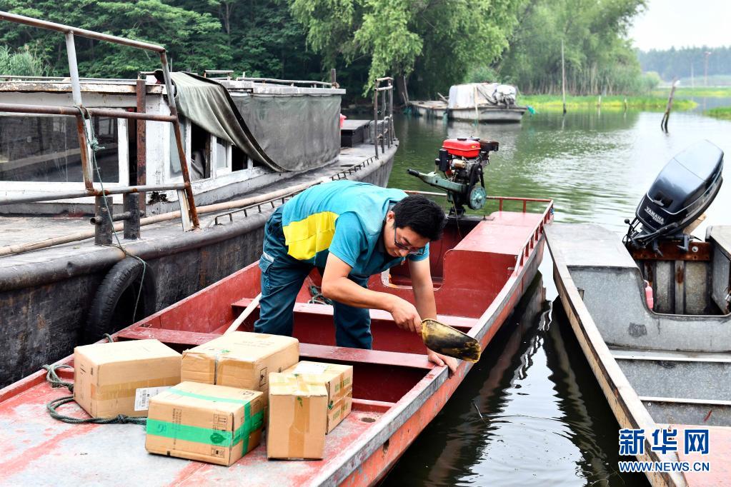 6月20日,在微山縣南陽鎮,郵遞員王少朋在清理郵船上的積水。