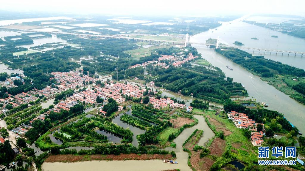 這是郵遞員王少朋服務(wù)的微山縣南陽(yáng)鎮(zhèn)一角,南陽(yáng)鎮(zhèn)四面環(huán)水,交通不便(6月20日攝,無(wú)人機(jī)照片)。