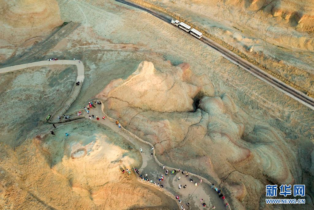 游客在新疆克拉瑪依烏爾禾世界魔鬼城景區(qū)內(nèi)拍照游玩(6月21日攝,無人機照片)。
