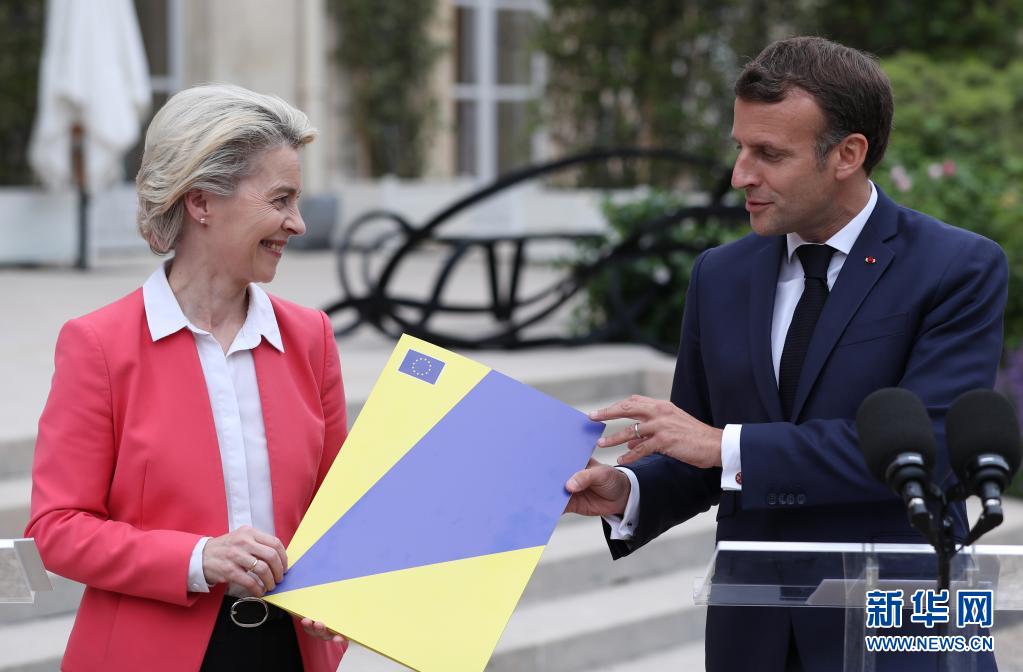 6月23日,法國總統馬克龍(右)與歐盟委員會主席馮德萊恩在巴黎總統府愛麗舍宮出席新聞發布會。