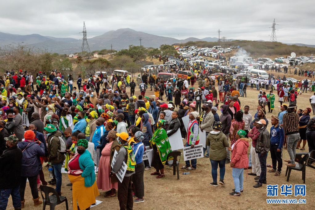 這是7月4日,南非前總統(tǒng)祖馬的支持者聚集在祖馬位于夸祖盧-納塔爾省恩坎德拉的家附近。