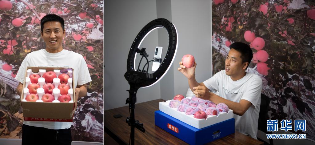 拼版照片:左圖為郭鋒杰展示山西省吉縣產的蘋果;右圖為郭鋒杰通過網絡直播銷售蘋果(7月9日攝)。今年32歲的郭鋒杰是吉縣古賢村人,常年在外從事建筑行業(yè)。吉縣有“蘋果之鄉(xiāng)”的美譽,看到吉縣蘋果在農村電商領域的發(fā)展?jié)摿Γh杰經過長期考察后,選擇返鄉(xiāng)創(chuàng)業(yè)。返鄉(xiāng)后,他忙著和果農洽談合作,聯(lián)系各大商超,自己也開起了網店,做起了“主播”。