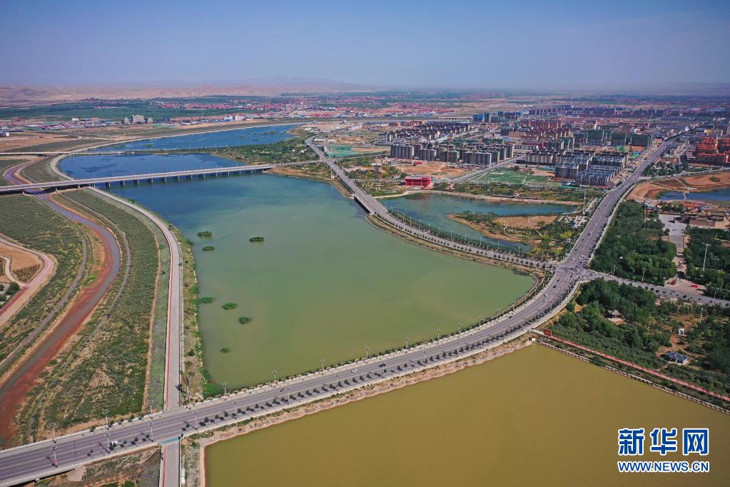 環繞著寧夏吳忠市同心縣縣城的清水河水系(6月22日攝,無人機照片)。新華社記者 王鵬 攝