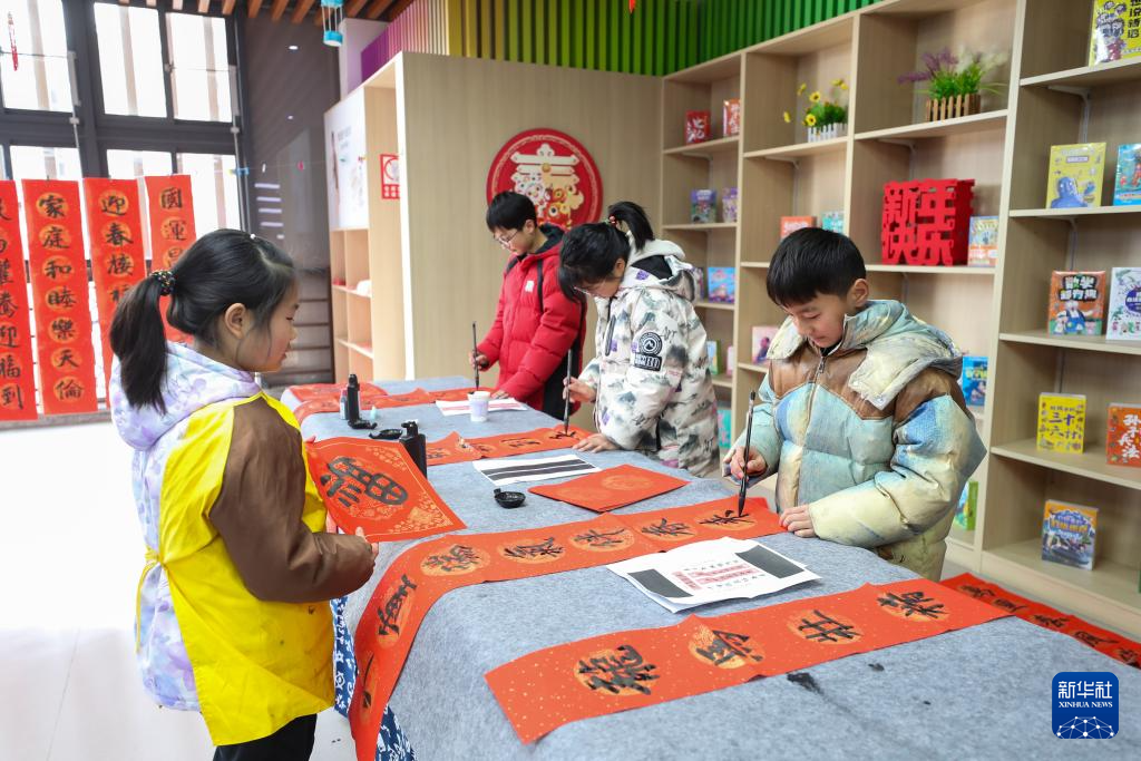 2月7日,在江苏省兴化市昭阳街道的一家新华书店,学生在“书香里的年味”新春主题活动中书写对联。