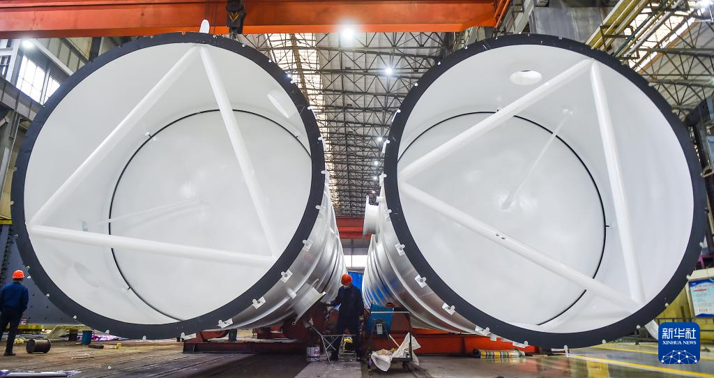2月25日,在位于河南省洛阳市涧西区的中信重工生产车间内,工人在装配应用于煤炭清洁高效利用的煤化工罐体装备产品。