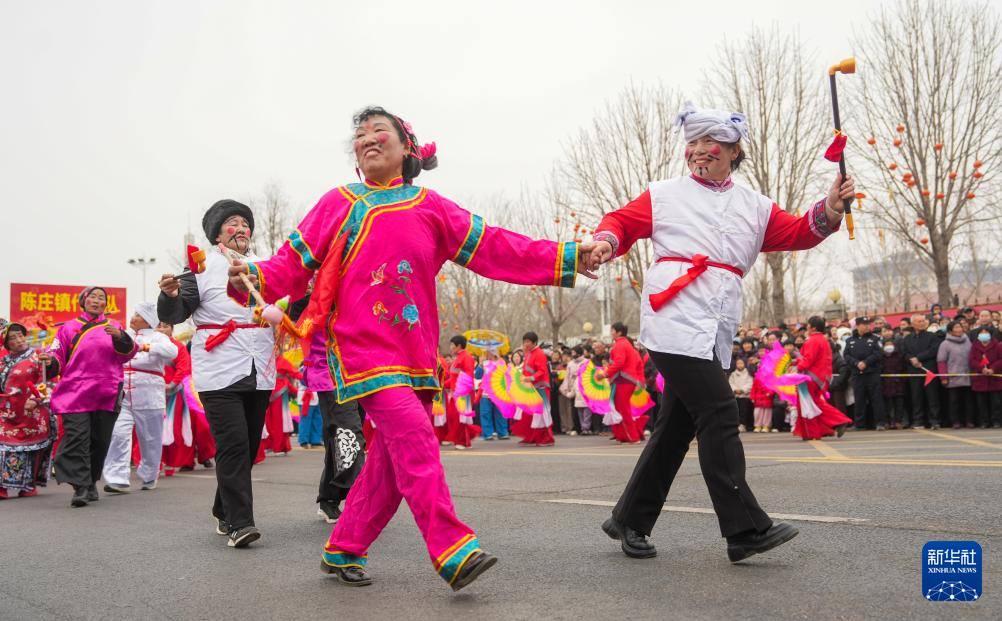 2月26日,人们在河北省灵寿县2026年新春民间艺术巡游展演活动中表演秧歌。