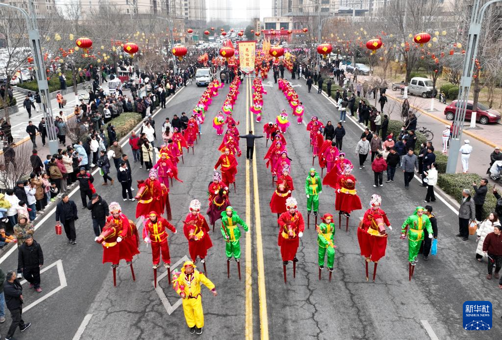 2月26日,民俗艺人在河北省灵寿县2026年新春民间艺术巡游展演活动中表演踩高跷(无人机照片)。