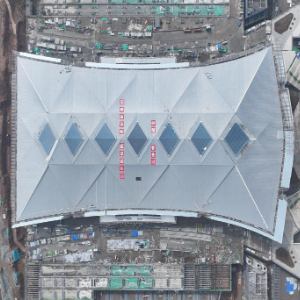 2月26日,工人在西安东站候车大厅内部进行吊顶安装。