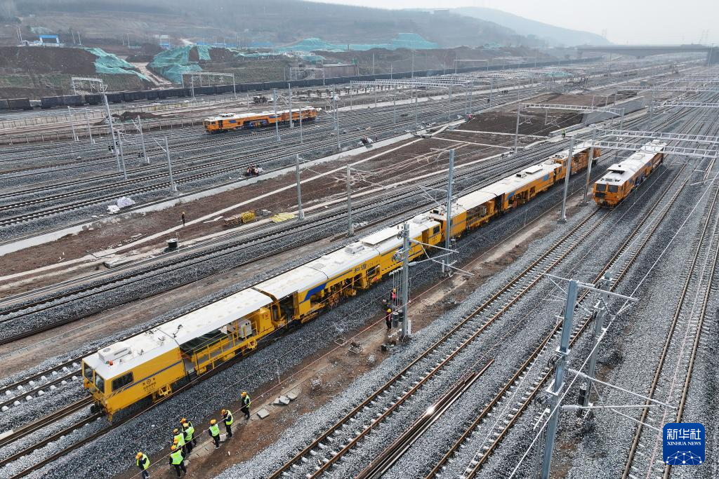 2月26日,大型养路机械在西安东站站场线路上作业(无人机照片)。