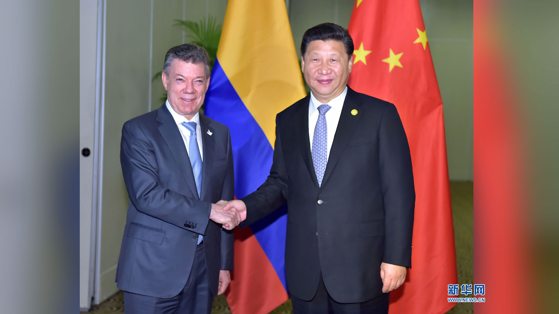 11月19日,國家主席習近平在利馬會見哥倫比亞總統桑托斯。新華社記者 李濤 攝2016-11-20