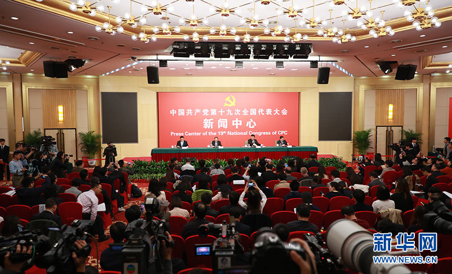10月21日,十九大新聞中心舉辦記者招待會,邀請中共中央統戰部常務副部長張裔炯、副部長冉萬祥,中共中央對外聯絡部副部長郭業洲介紹黨的統一戰線工作和黨的對外交往情況,并回答記者提問。圖為記者招待會現場。新華網 郝廣鵬攝