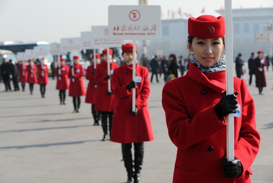 [兩會花絮]會場外的紅衣靚影