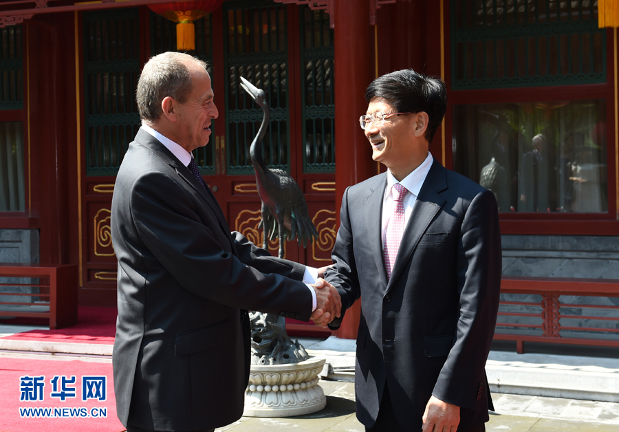 ??? 9月7日,中共中央政治局委員、中央政法委書(shū)記孟建柱在釣魚(yú)臺(tái)國(guó)賓館會(huì)見(jiàn)由主席佩里率領(lǐng)的英國(guó)48家集團(tuán)俱樂(lè)部代表團(tuán)。 新華社記者張領(lǐng)攝