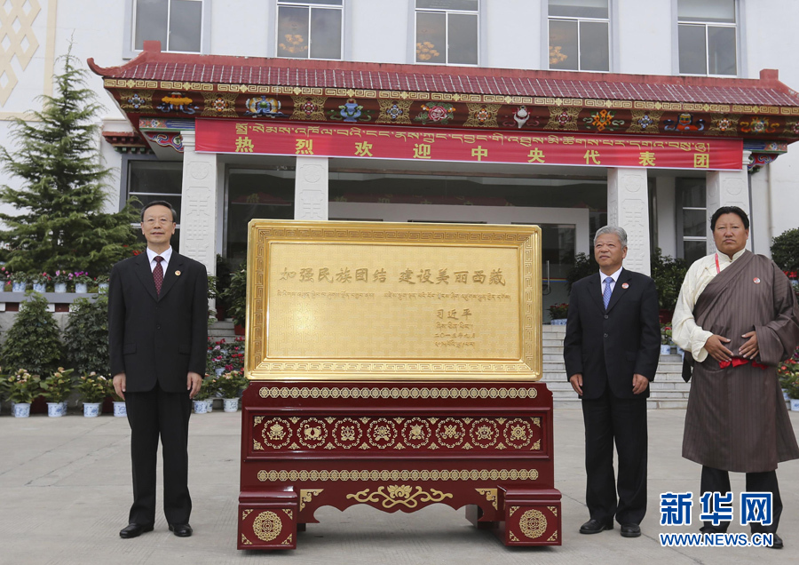 ??? 9月9日至10日,中央書記處書記、全國(guó)政協(xié)副主席、中央代表團(tuán)副團(tuán)長(zhǎng)杜青林率林芝分團(tuán),帶著以習(xí)近平同志為總書記的黨中央對(duì)西藏各族人民的深切關(guān)懷和全國(guó)人民的美好祝福,看望慰問當(dāng)?shù)馗髯甯刹咳罕姟_@是9月10日,杜青林向林芝市贈(zèng)送習(xí)近平總書記題詞“加強(qiáng)民族團(tuán)結(jié) 建設(shè)美麗西藏”賀匾。 新華社記者丁林?jǐn)z